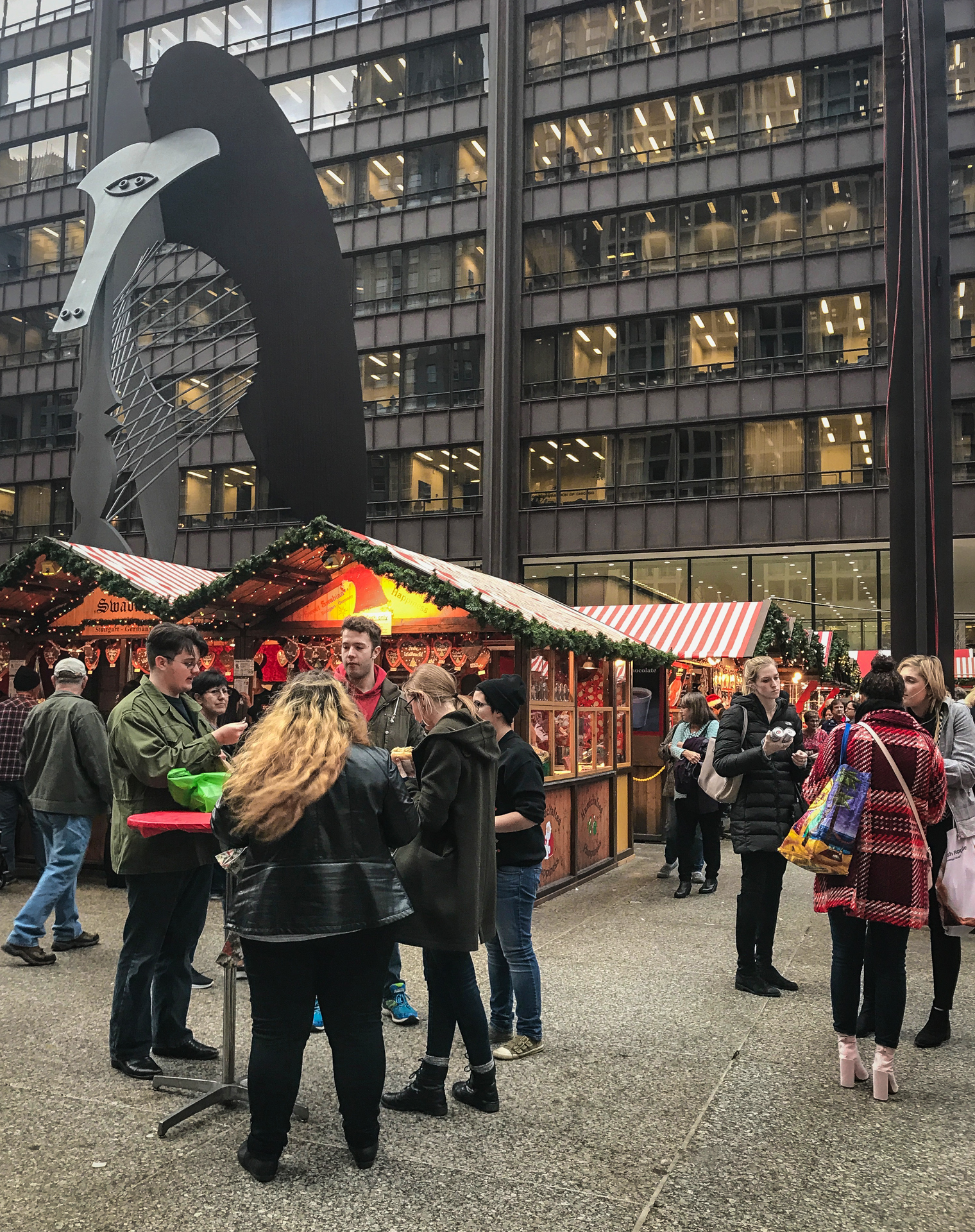 Christkindlmarket, mercadito navideño en la Plaza Daley de Chicago, presidida por una escultura de Pablo Picasso.