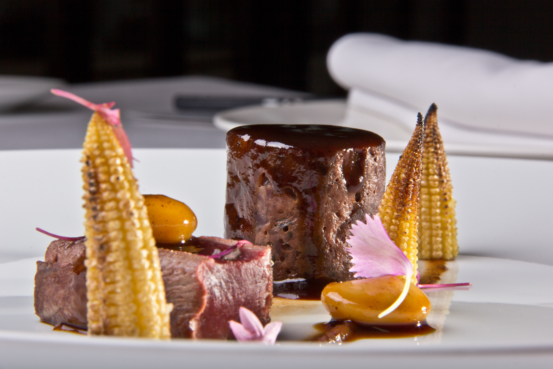 Rosal de liebre, salsa de ciruelas negras, maíz y judiones, restaurante El Carmen de Montesión, Toledo. Foto: Cortesía del restaurante.