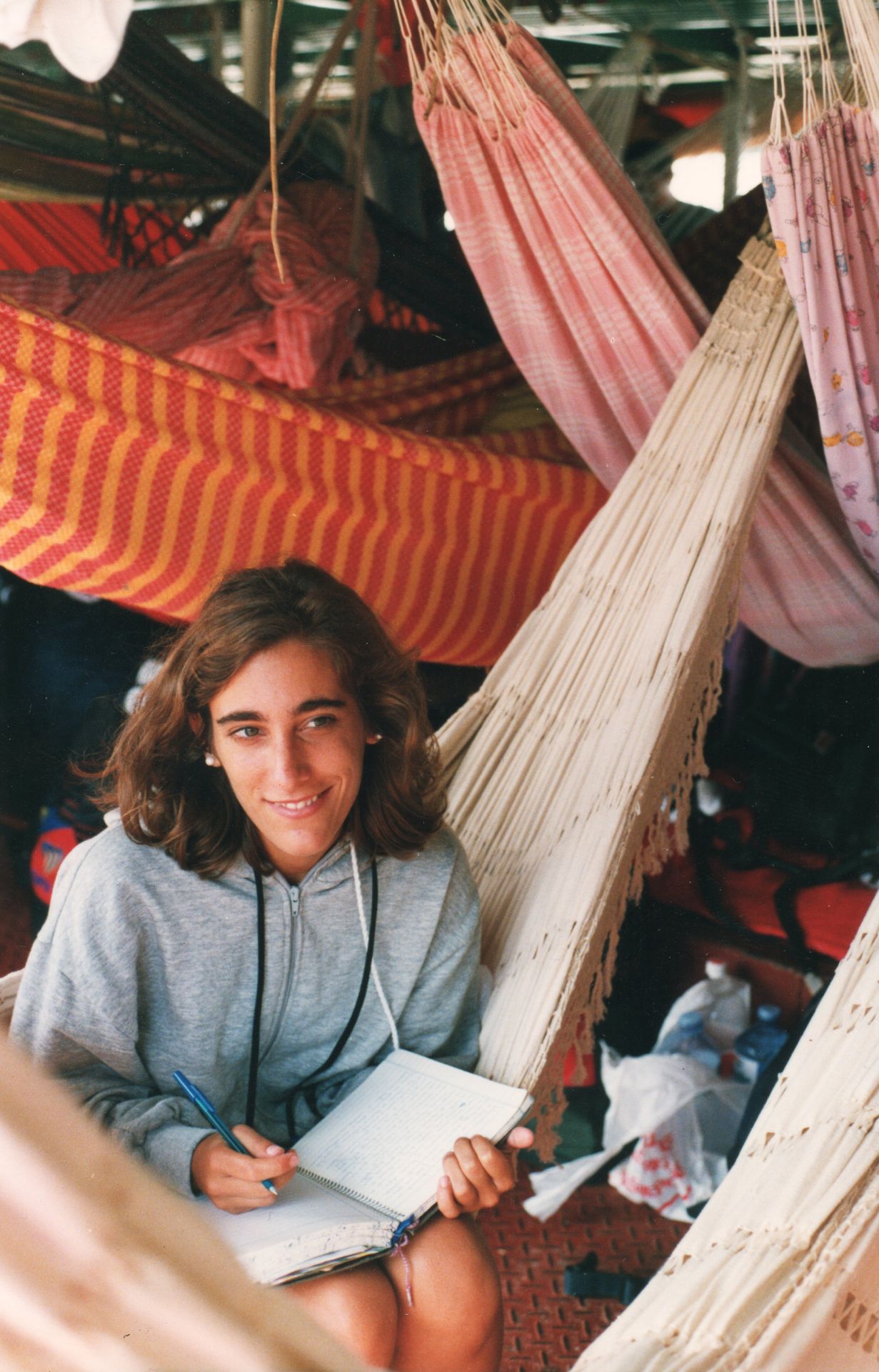 Navegando por el río Amazonas rumbo a Manaus, Brasil, mientras escribo en mi cuaderno de bitácora. Febrero de 1993.